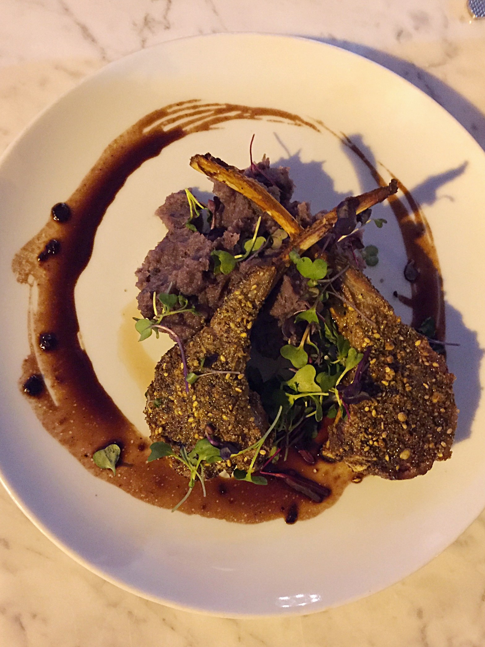 For our main course we enjoyed the free-range Australian Lamb Chops with beautiful purple Okinawa potatoes and hazelnut almond spice crust. The dish which is served with perhaps the most pomp and circumstance at Maison 208 is the Whole Frenched Dorade. The server brings it to your table with a gleaming silver cover. Don’t gasp with shock as you see this lifeless fishy face staring up at your from your plate because you’ll thoroughly enjoy his deliciousness! This dorade is pan-fried and served in a mushroom broth with petit vegetables.
