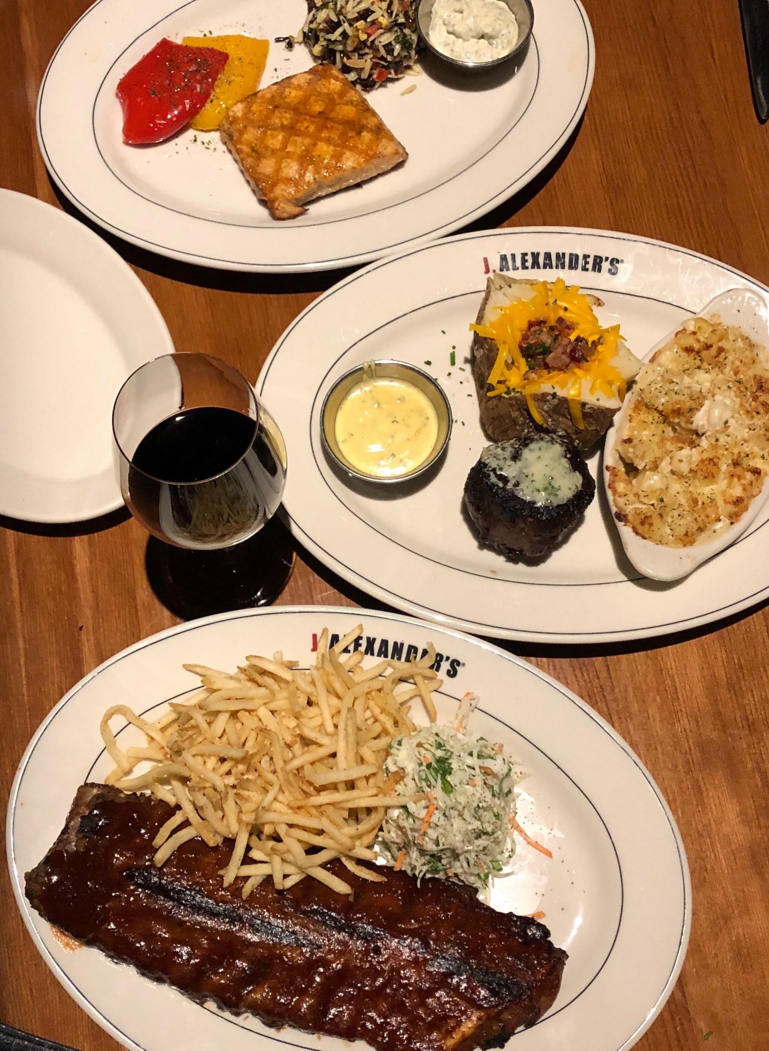 Add Alex’s Salad with bacon, cheese, tomatoes, cucumbers and rustic croutons to any entrée for only $5. We tried the Filet Mignon with Loaded Baked Potato (yup it’s loaded with butter, bacon, cheddar cheese, and sour cream. At J.Alexander’s every steak is finished with Maître d’ butter and all steaks and prime rib are Certified Angus Beef.