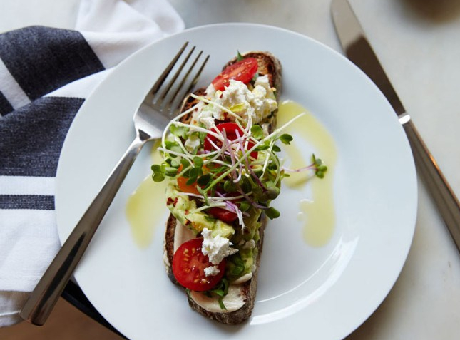 - Top each slice with cherry tomatoes, feta, and arugula to garnish and an optional poached or sunny-side up egg for protein! (Serves 2)