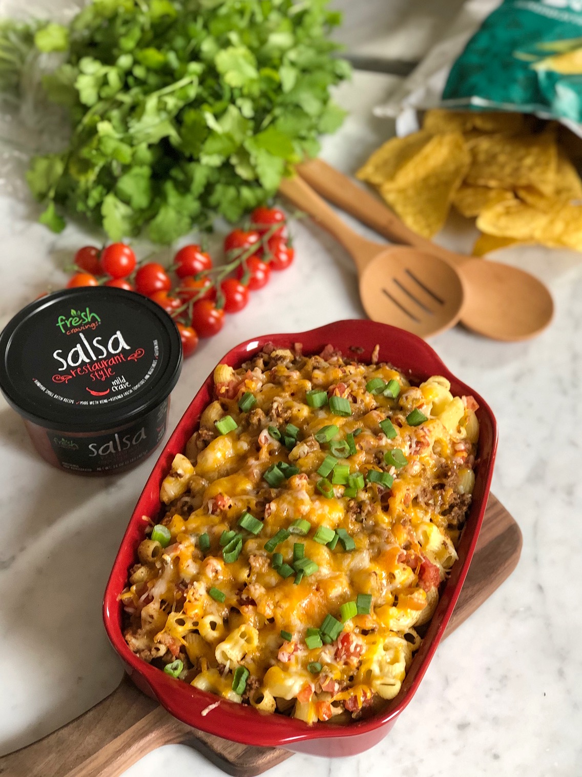 As the weather gets warmer this time of year we’re all about adding some fresh flavors to our cooking! That’s why we love Fresh Cravings Salsa. Their salsa isn’t sold in a jar, you can find in the refrigerated section of the grocery store (usually in the produce section). Loaded with vine-ripened tomatoes, herbs, and fresh jalapeño, Fresh Cravings Salsa has all the bold flavors you love. This recipe was inspired by bold flavors and our love for tacos- this recipe is for hearty Tex Mex Pasta. It is perfect for a satisfying dinner your whole family is sure to love. Plus we bet you might even have some leftovers for lunch the next day.